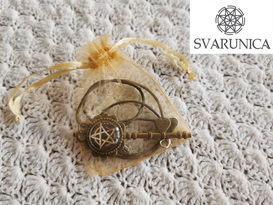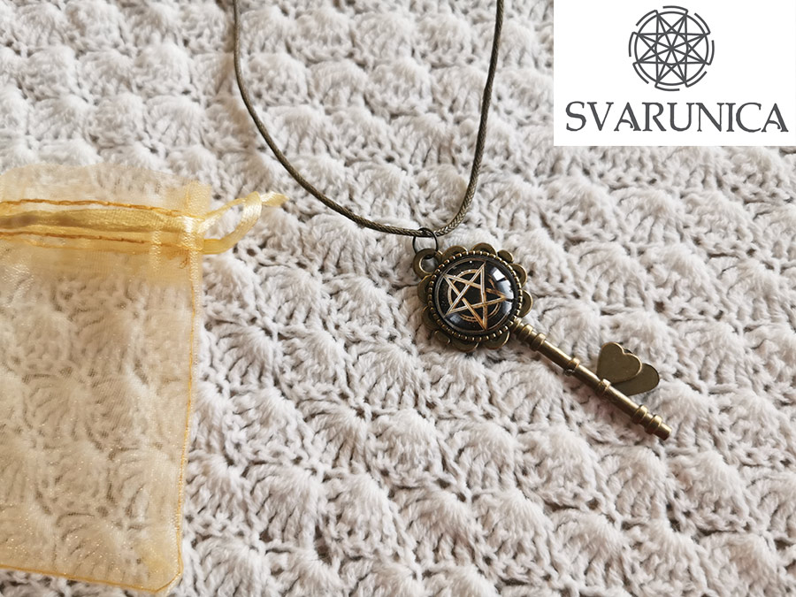 Obesek medeninaste barve izdelan iz antika brez niklja, motiv Morine tace je velik 2 cm. Obesek se nahaja na rjavi bombažni vrvici.